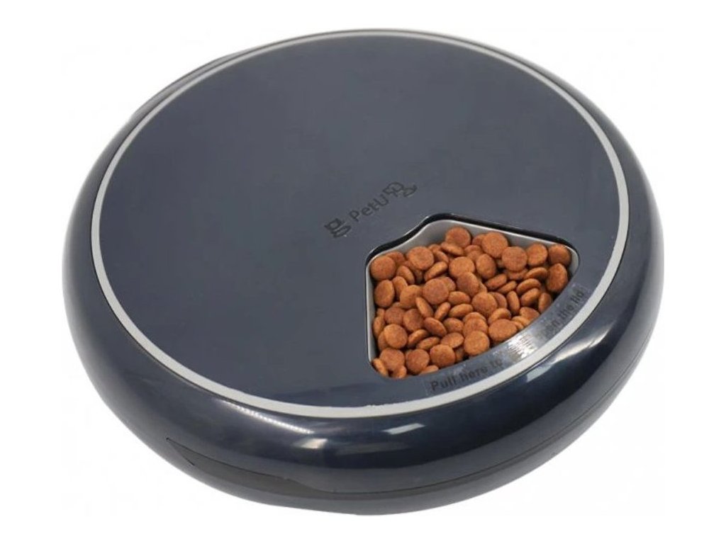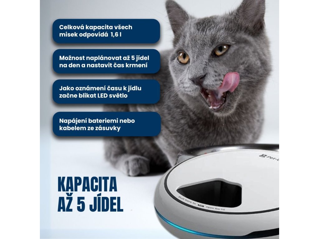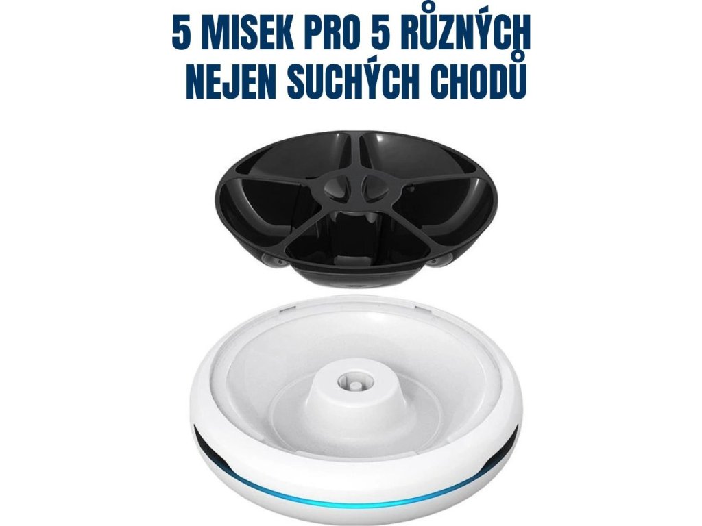 Elegantně navrženou a skladnou krmičku si Váš mazlíček zamiluje. Lze vložit až 5 jídel na den a nastavit čas, kdy se Vašemu miláčkovi příslušná miska objeví. Jako oznámení času k jídlu začne blikat LED světlo na přední straně produktu, které můžete doprovodit 10 sekundovou hlasovou zprávou. Díky voděodolné úpravě je možné do misek připravit i jiné pokrmy než jen ty suché. K provozu tohoto zařízení budete potřebovat buď 3x 3D baterie anebo nabíjecí kabel, jenž je součástí balení.