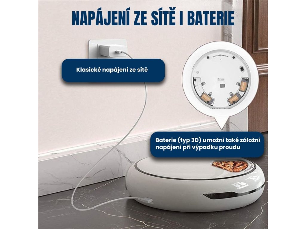 ✔ Dva zdroje napájení pro bezpečný provoz – funguje na baterie i adaptér 5 V/1 A, navíc zálohováno při výpadku proudu